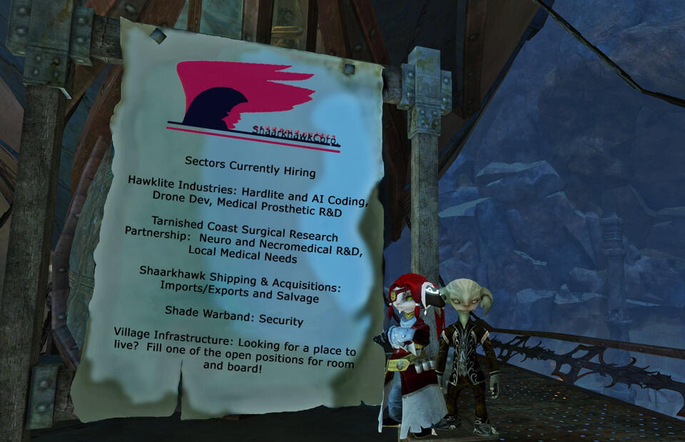 Whether you were recommended to Shaarkhawk for work or lodging, your journey begins now. Apply to the sectors that hold your fancy, and enjoy varied amenities.Room and board are available, as well as local medical care for most conditions. You will have access to the local and Rata Sum data networks and our multiple libraries. Our village also boasts a remote Priory outpost and research trove. Shaarkhawk Corporation also offers a generous patent development grant to aspiring inventors and tuition reimbursement for those looking to expand their techniques.Employment is dependent on background check; education can be supplemented by firsthand experience. NO FORMER INQUEST OR PIRATE AFFILIATION. (Flame Legion accepted on a case by case basis.)
